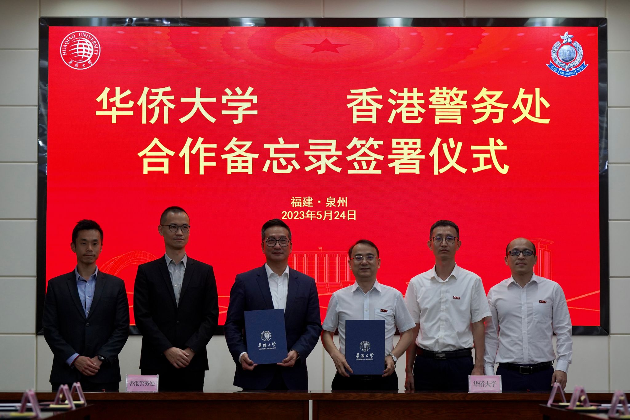 5月24日下午,华侨大学与香港警务处合作备忘录签署仪式在陈嘉庚纪念堂二层会议室举行。华侨大学副校长王建华与香港警务处助理处长陈民德代表双方签署协议。